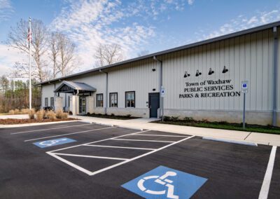 New Parks & Recreation and Public Services building completed for the Town of Waxhaw. The project includes administrative offices for the Parks & Recreation and Public Services departments as well as interior service bays and exterior bays for housing trucks and equipment.